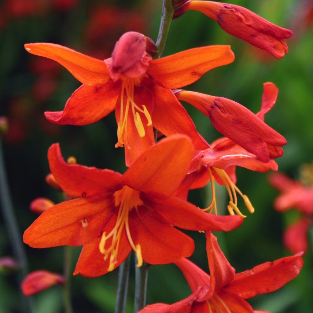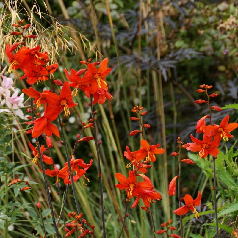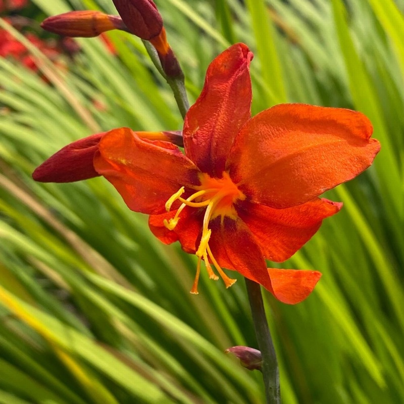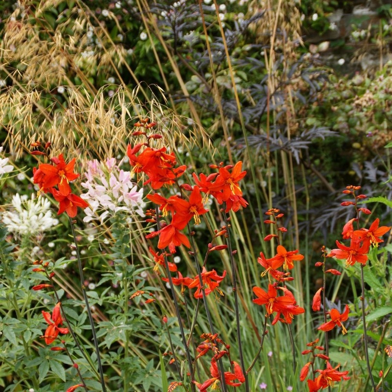The flowers of 'Babylon' are large and dusky orange/red with maroon markings and a yellow throat. They are downward facing, held on upright stems. Dusky unpleated leaves.