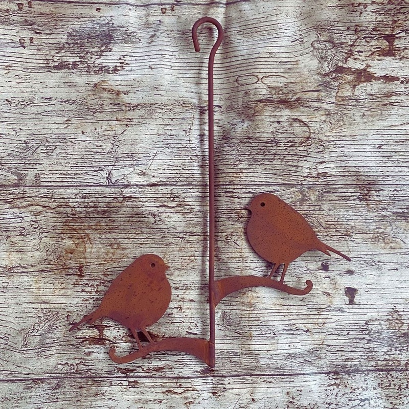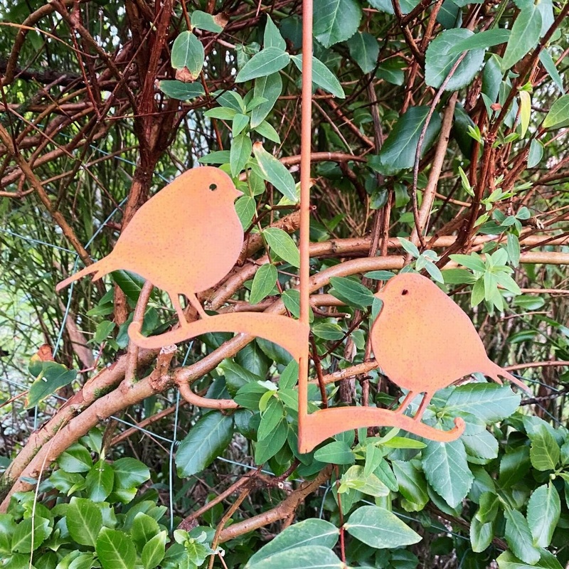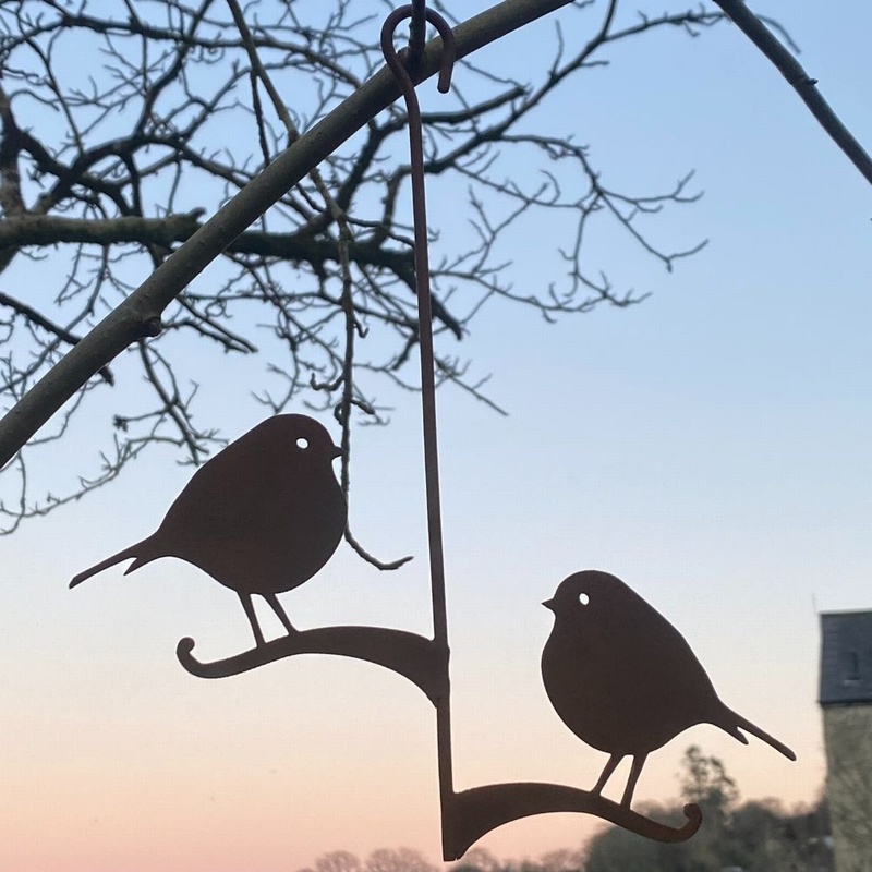 This rusted silhouette depicting a pair or robins handily comes on a hook so you can hang it around the garden - it looks lovely suspended from a tree or shrub, or anywhere that suits. I have mine where it stands out against the setting sun. <br>